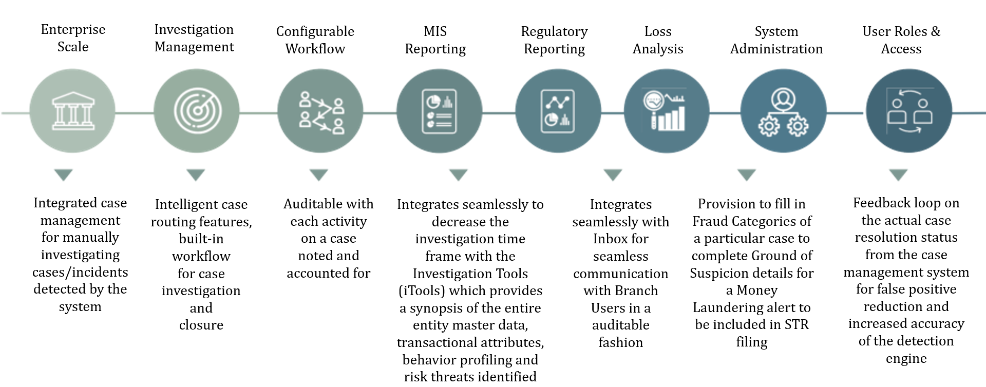 • Integrated Case Management with built-in alert routing and work-flow management for alert investigation.